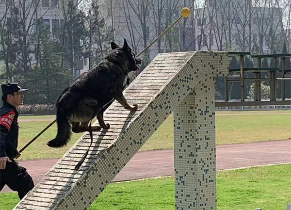 最后,陈警官带领队员们观看了警犬表演。今天给队员们表演的警犬叫“钢炮”,钢炮在前几天的训练中不小心受伤了,只能负伤给队员们表演了障碍跑。只见陈警官一声令下,钢炮就像箭一样冲了出去,冲破重重障碍,顺利到达终点,那闪电般的速度让队员们不禁鼓掌叫好。
