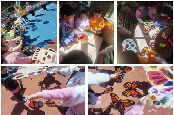当彩色塑封纸和阳光发生碰撞时,它们在光的照耀下都“活”了起来,栩栩如生。引得幼儿在园内各处进行光影的探索之路。