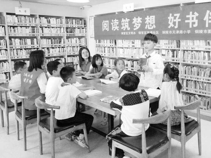 4月20日,在铜官区官塘社区阅读室,来自天津路小学的学生正在分享阅读感悟。据了解,为培养辖区青少年“爱读书、读好书、善读书”的阅读习惯,在第27个“世界读书日”即将到来之际,该社区举办“阅读筑梦想,好书伴成长”读书分享会活动,邀请辖区小学生参加,共品书香。 (潘伟 朱紫芸)