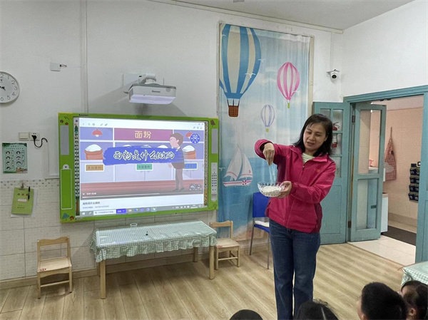 首先,老师向孩子们介绍了面粉以及它的由来、种类和形状等,同时告诉孩子面粉是如何变成面团的,并让孩子亲手触摸面粉,激发他们学习兴趣。