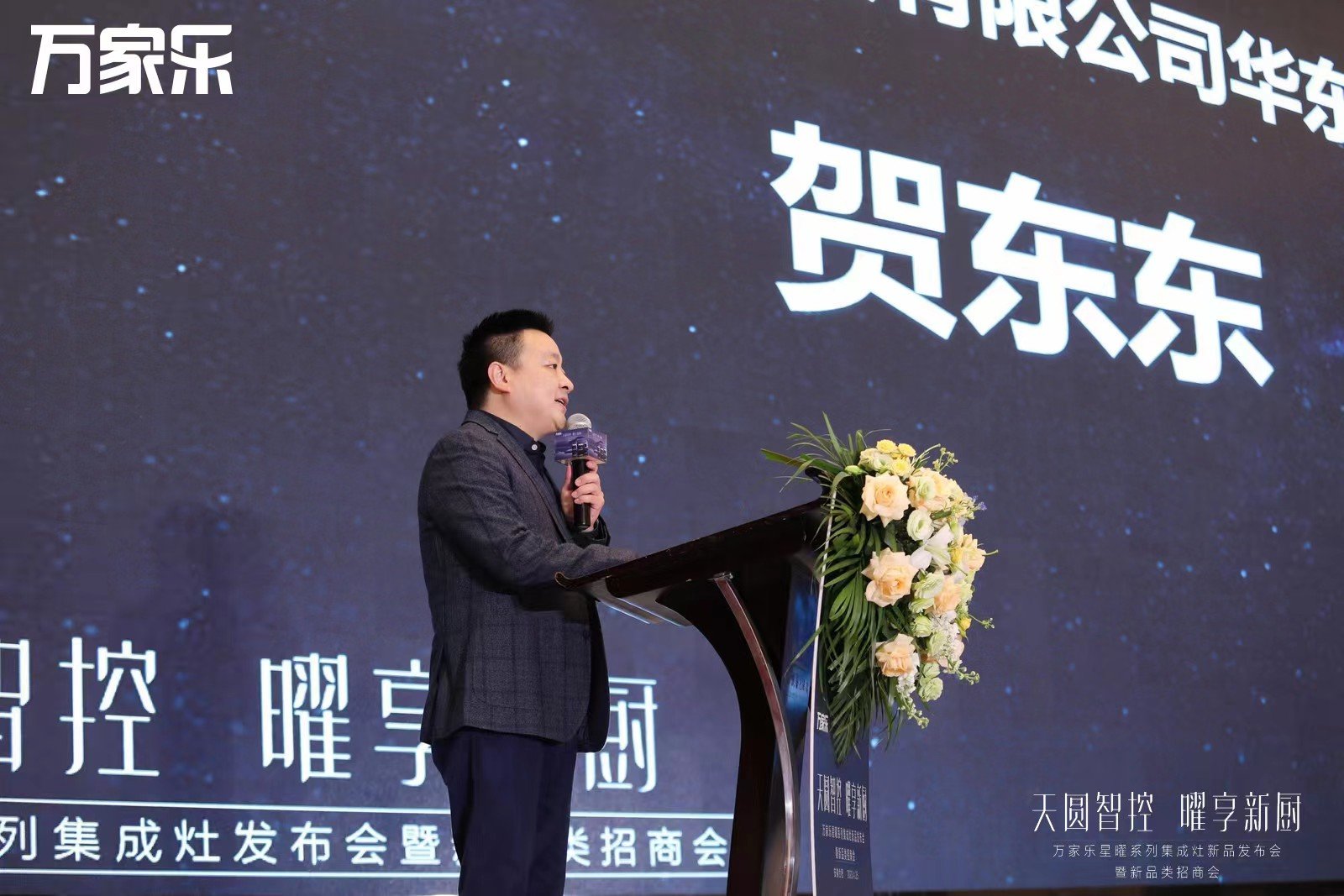 作为本次会议的东道主,万家乐华东大区总经理贺东东致欢迎词。贺总指出,万家乐始于1985年,38年来一直致力于为用户打造品质、快乐、美好的生活。今天即将发布的星曜系列集成灶,使我们万家乐人更有信心和责任做好产品推广,服务好我们的用户,将美好生活带给更多家庭,助力中国智造。