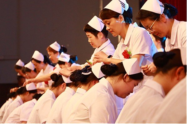 伴随着乐曲旋律,神圣庄严的授帽仪式开始,朱延玲带领临床一线专家,来自省内四家医院护理部主任以及护理学院专业老师为学生代表进行了授帽。在南丁格尔肖像面前,全体师生手捧烛台,庄严宣誓,一句句掷地有声的南丁格尔誓言在闪烁的烛光中荡漾。