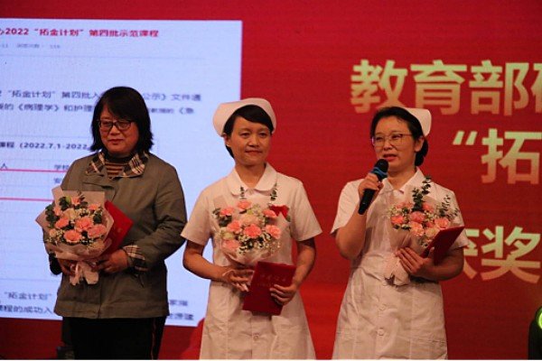 突出贡献奖颁奖活动环节,表彰了在2022年度为学校和学院做出突出贡献的师生,他们是全国职业院校技能大赛高职组护理技能赛项二等奖指导教师燕玲、刘东梅;精品课程成功入选教育部在线研究中心2022“拓金计划”第四批示范课程教师胡凤琴,全国职业院校技能大赛高职组二等奖获得者杨雨晴、王嘉佳,安徽省职业院校技能大赛高职组一等奖获得者陈影丽、黄敏、肖书晴、张晴晴,现场还邀请了刘东梅老师上台发表感言,和大家分享参赛经验。