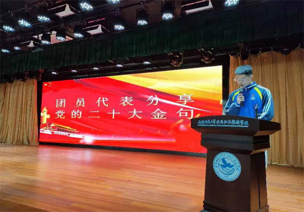 全体团员、学生代表共同观看了“学习二十大 永远跟党走 奋进新征程”主题云团课。同学们聚精会神,认真聆听,将学习到的理论知识记录下来。观看结束后,学生团员代表白艺凡分享了党的二十大的部分金句和他的学习心得。