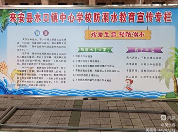 除此以外,学校还利用各种形式进行防溺水提醒和教育。利用教学楼电子屏,循环播放防溺水“六不准”;设立防溺水安全教育专题宣传栏;要求班主任在班级微信群每周进行防溺水宣传资料的推送和周末及节假日的防溺水安全提醒。