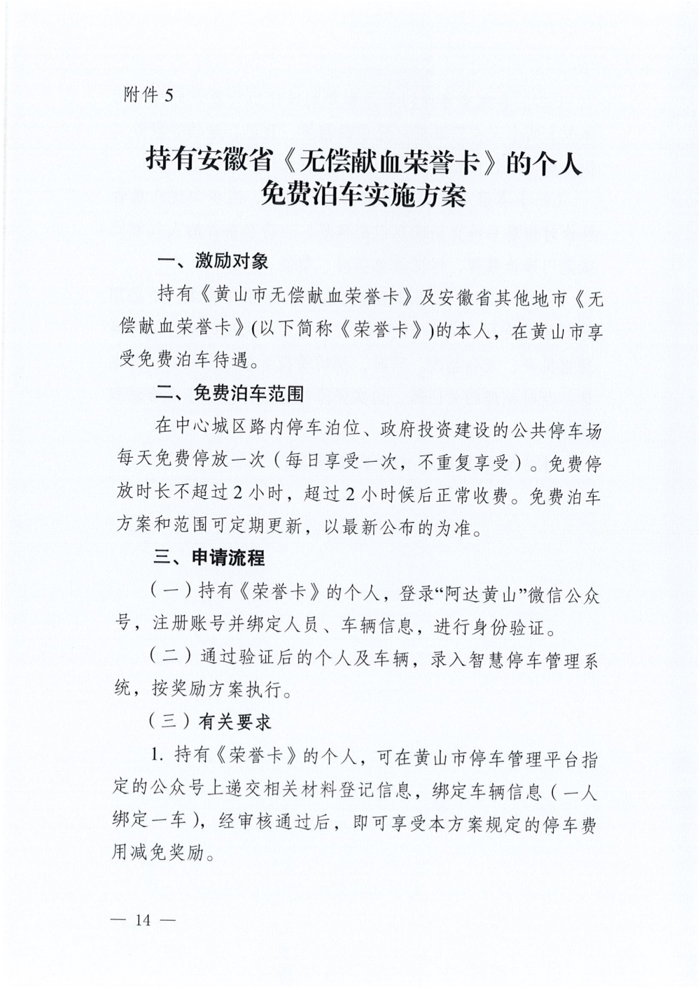 4、免费泊车:在中心城区路内停车泊位、政府投资建设的公共停车场每天免费停放一次(每日享受一次)。免费时长不超过2小时。登录“阿达黄山”微信公众号注册并绑定人员、车辆信息(一人绑定一车)。免费泊车方案和范围可定期更新,以最新公布为准(详见《免费泊车实施方案》)。