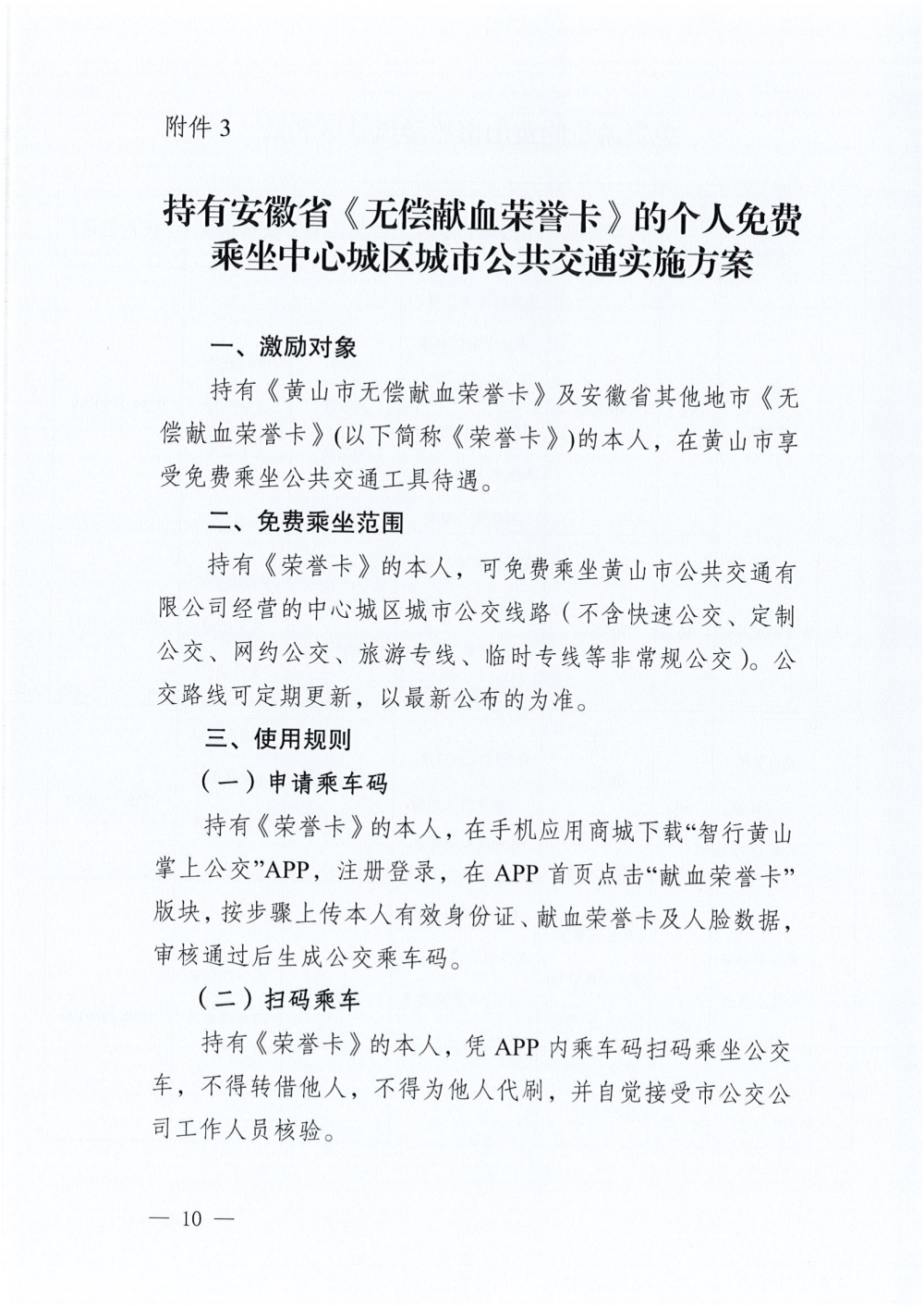 1、免费乘坐城市公共交通工具:持《荣誉卡》本人,可免费乘坐黄山市公共交通有限公司经营的中心城区城市公交线路(不含快速公交、定制公交、网约公交、旅游专线、临时专线等非常规公交)。手机下载“智行黄山掌上公交”APP,注册登录-点击“献血荣誉卡”版块-按步骤上传本人信息-形成公交乘车码。公交路线可定期更新,以最新公布为准。(具体见《免费乘坐中心城区公共交通实施方案》)