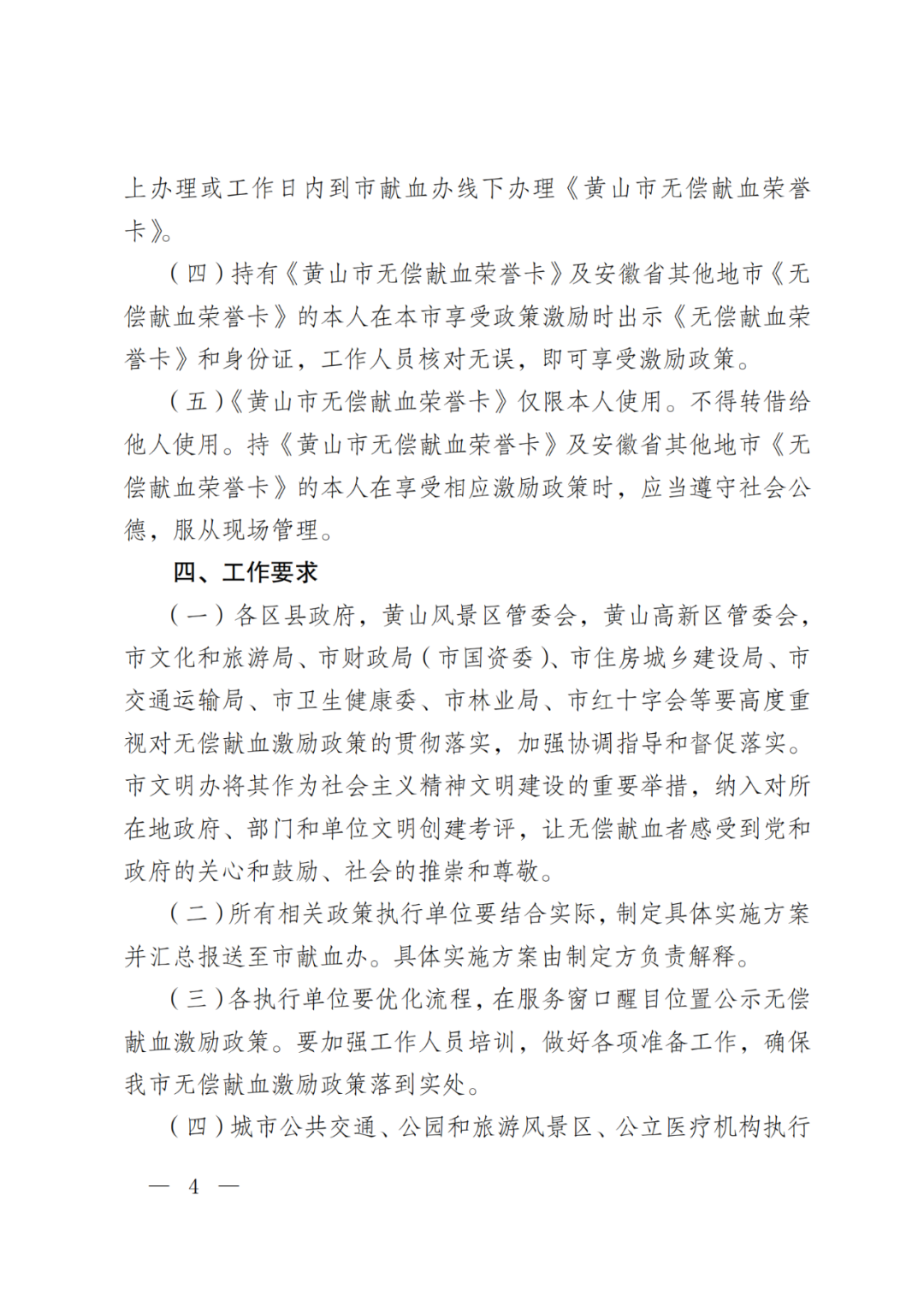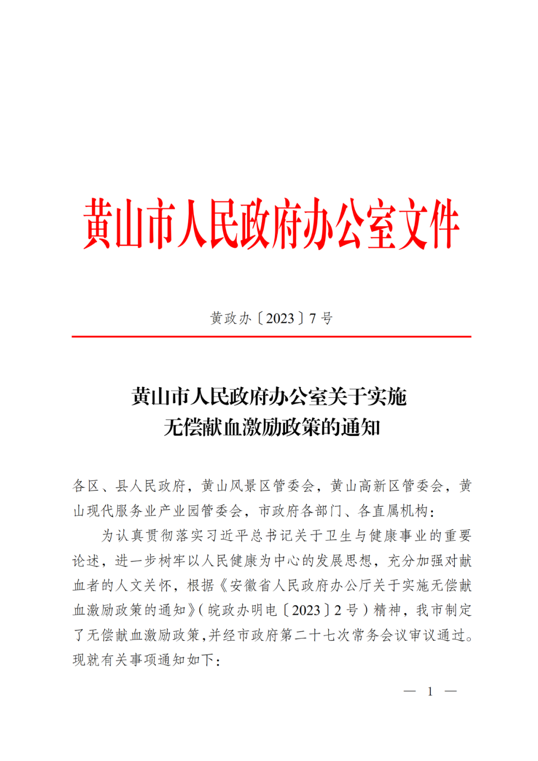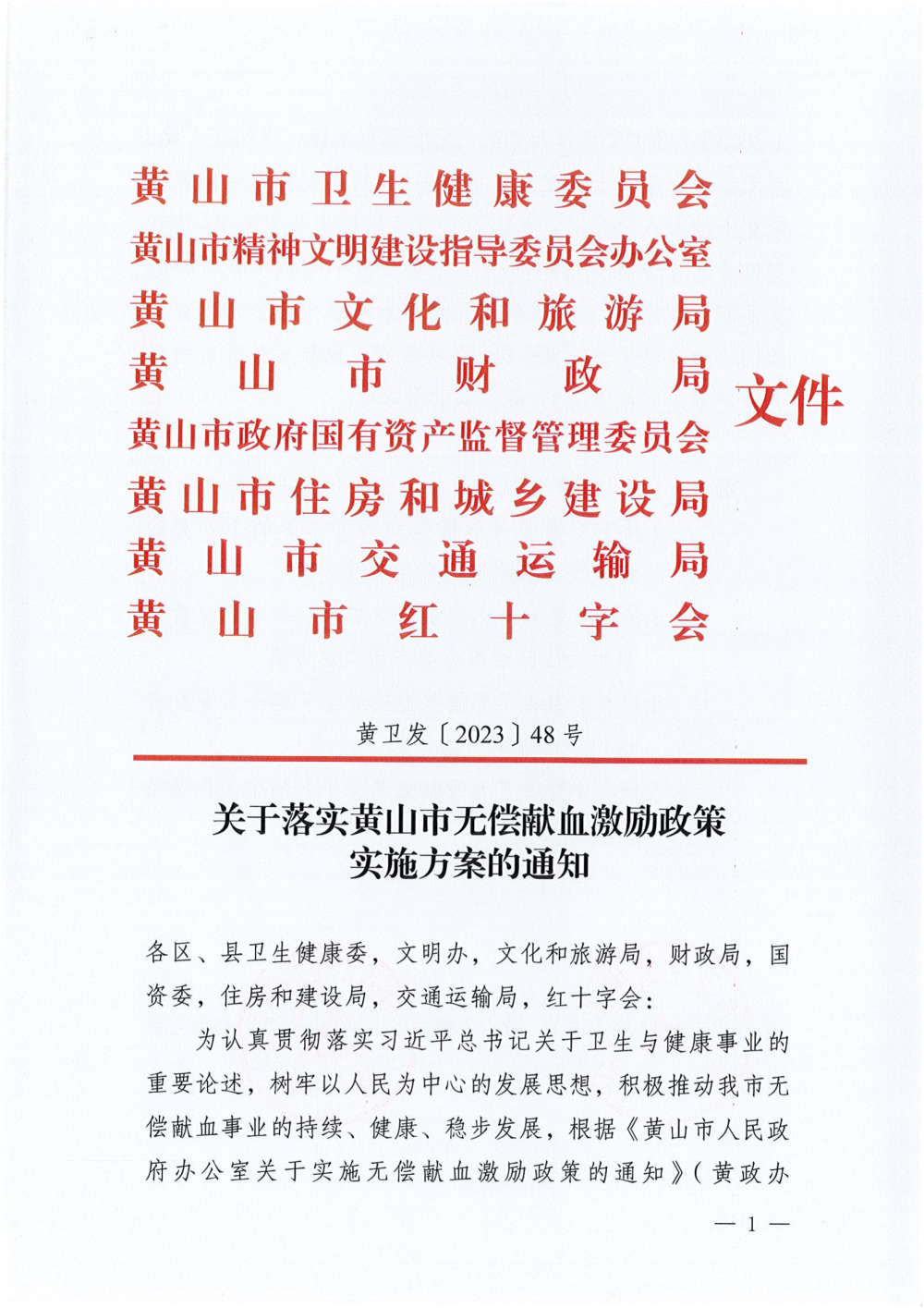 《关于落实黄山市无偿献血激励政策实施方案的通知》