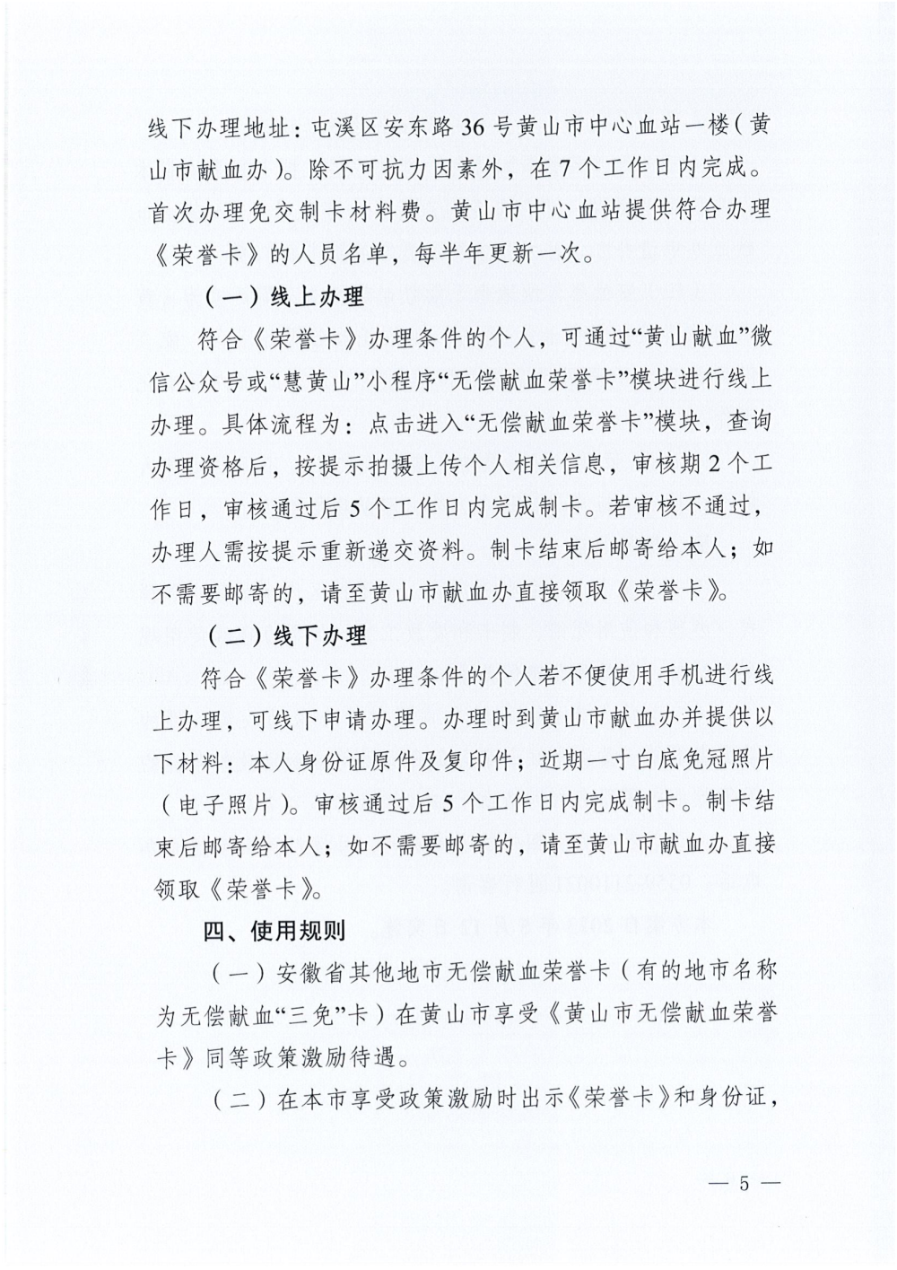 (1)献血者本人可通过关注黄山市中心血站微信公众号或“慧黄山”小程序“无偿献血荣誉卡”模块线上办理(审核期2个工作日,审核通过后5个工作日内完成制卡)。
