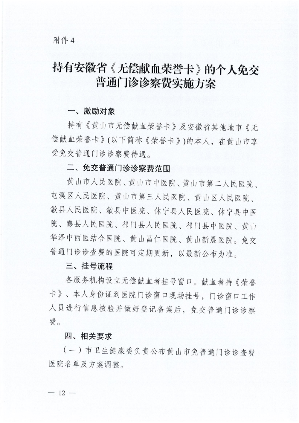 3、免交普通门诊诊察费:黄山市人民医院、黄山市中医院、黄山市第二人民医院、屯溪区人民医院、黄山市第三人民医院、黄山区人民医院、歙县人民医院、歙县中医院、休宁县人民医院、休宁县中医院、黟县人民医院、祁门县人民医院、祁门县中医院、黄山华泽中西医结合医院、黄山昌仁医院、黄山新晨医院,设立无偿献血者挂号窗口。免交普通门诊诊察费的医院可定期更新,以最新公布为准(具体见《免交普通门诊诊察费实施方案》)