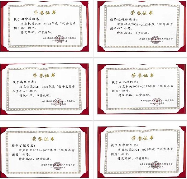 5月5日,省直机关召开“学习二十大 永远跟党走 奋进新征程”主题团日暨表彰先进大会。省直机关工委副书记谢兵、团省委副书记李波出席并讲话,工委副书记朱宗庄、二级巡视员杨祖涛、省直党校常务副校长虞美顺等出席会议。省直团工委委员,省直青联副主席,省直机关团组织负责同志以及团员青年代表等230余人参会。会上,对受表彰的青年集体、项目、个人进行了表彰。安徽医学高等专科学校关承钦、丁颖、周宇航获省直机关2021-2022年度“优秀共青团员”称号;高杨获省直机关2021-2022年度“青年志愿者优秀个人”称号;周紫薇、沈健桥获省直机关2021-2022年度“优秀共青团干部”称号。
