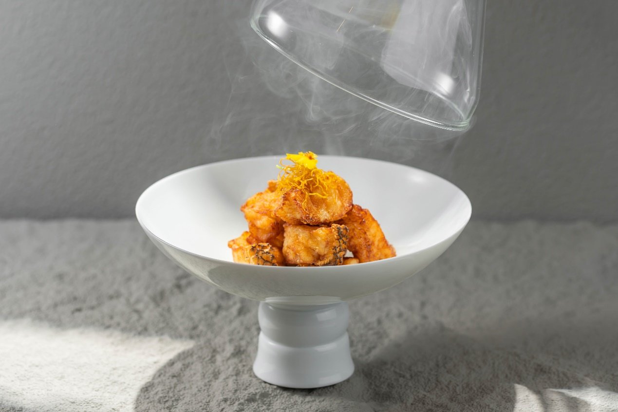 “招牌三葱爆龙虾”是唐阁主厨传承菜式,选用新鲜小澳龙,辅以干葱头、青葱段及洋葱,香气互相交融弥补,层次丰富。“焗酿鲜蟹盖”选用富有“海中人参”美誉的新鲜青蟹,蟹肉的鲜美和洋葱的鲜甜相辅相成,入口唇齿留香。“脆皮花胶伴瑶柱清汁”精选质地上乘的4-5头花胶,炸后外层轻脆内里鲜嫩,配以瑶柱清汁,鲜甜、甘香、清爽。“特色烟熏鳕鱼”将洁白剔透的银鳕鱼烟熏后炸至表面金黄,裹上的秘制酱汁微微渗入,表面酥脆,内里细腻。“唐阁脆皮鸡”甄选优质湛江鸡,腌制后风干入油炸,皮脆肉滑多汁。更有金汤珍珠大明虾球、松露和牛礼物盒、虾籽鲜菌麒麟东星斑、三葱爆元贝等主厨灵感佳肴静待探索。