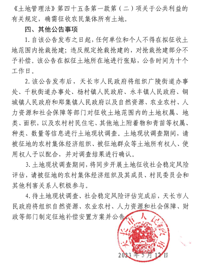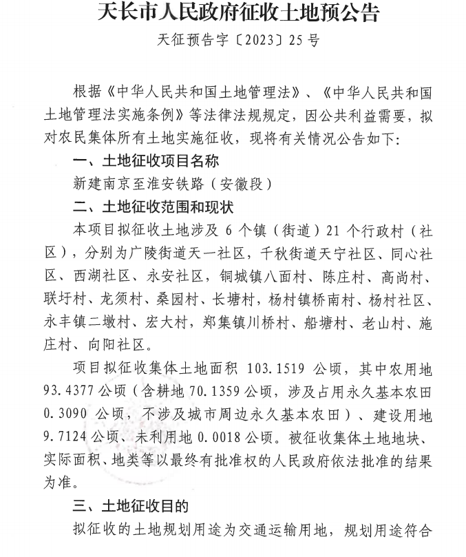 为新建南京至淮安铁路(安徽段),近日,天长市人民政府发布征收土地预公告,涉及6个镇(街道) 21个行政村(社区)。