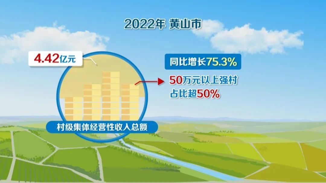 在“五微”行动指引下,目前,黄山市累计建成长三角绿色农产品生产加工基地25个,全市农村产品年网络销售额39亿元。2022年全市村级集体经营性收入总额4.42亿元、同比增长75.3%,50万元以上强村占比超50%,农民人均收入多年位列全省第一方阵。