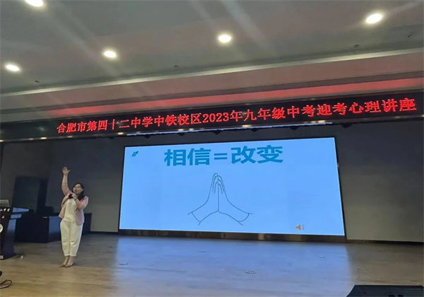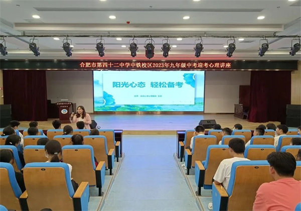 为缓解九年级学生中考迎考的紧张和焦虑情绪,5月15日下午,合肥市四十二中学中铁校区邀请安徽心港心理服务有限公司王霞老师进校园为同学们开展“阳光心态、轻松备考”心理讲座。