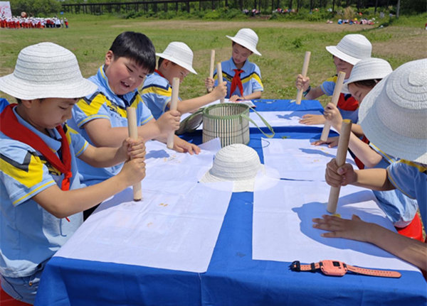 最后,孩子们又开展了草木敲拓染的手工活动,一片叶子,一朵小花,一株小草,在孩子们的手中任意组成一幅幅美丽的画,小木锤敲啊敲,植物天然的色彩染于布上,完成了一幅幅独一无二的手工作品。通过文化教育、手工制作,锻炼孩子的动手技能和综合素质,增强学生自然审美和人文审美的感知能力。
