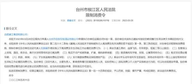 另外,合肥建工集团还多次被限制高消费。天眼查显示,最近的一次是5月10日,在立案执行申请人台州市创发垃圾清运有限公司申请执行合肥建工集团有限公司运输合同纠纷一案,因合肥建工集团有限公司未按执行通知书指定的期间履行生效法律文书确定的给付义务,合肥建工集团有限公司及公司法定代表人刘国富被限制高消费。