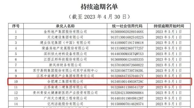 近日,上海票据交易所披露了《截至2023年4月30日持续逾期名单》,合肥建工集团有限公司位列其中。