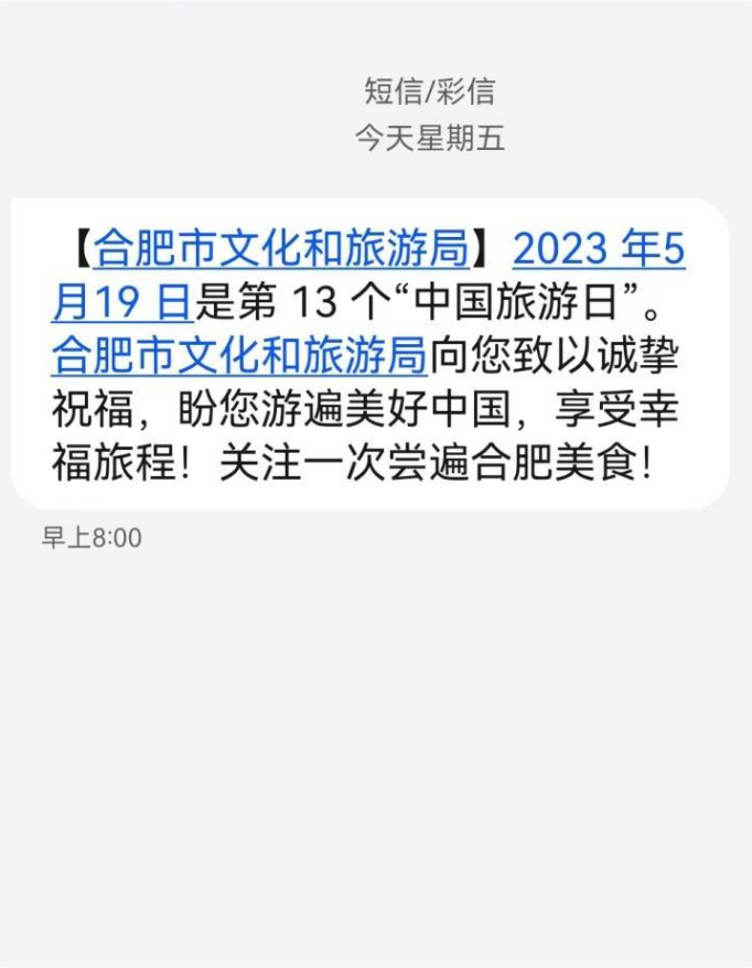 此外,5月17日至5月19日期间,移动、联通、电信三大运营商共发送祝福短信120万条,诚邀广大游客在合肥开启幸福旅程,提升文化“触达率”,点燃出游热情。