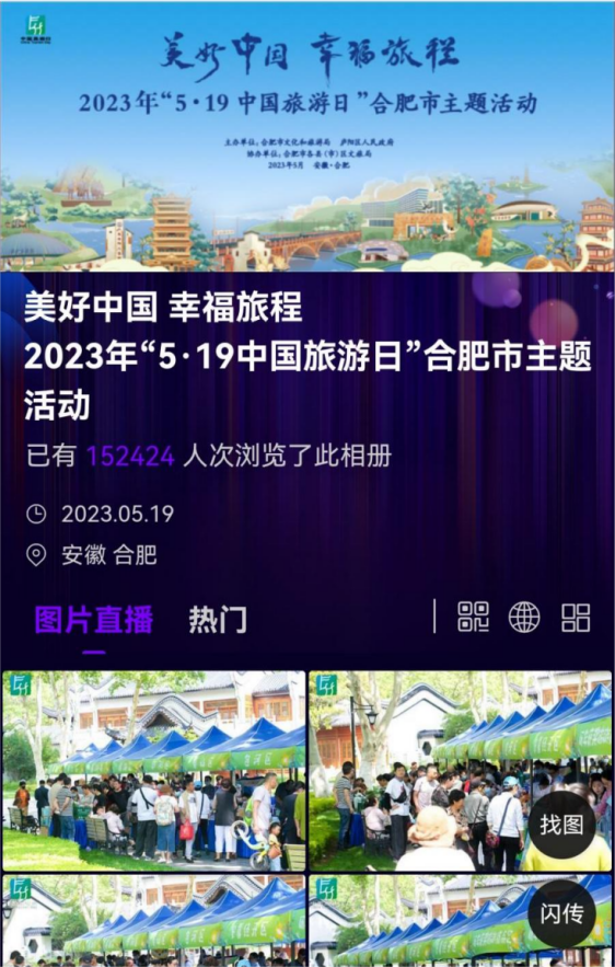 活动借助新媒体平台进行推广,通过“千号联动”,打造立体式宣传矩阵,同时充分调动线上参与性,特邀知名导游@合肥喵喵姐,旅游达人@楠姐姐520、@摄影师李潇、@合肥生活、@玩相机的小崔进行景区现场直播,推介三河古镇、巢湖姥山岛、合肥融创乐园等知名景点,掀起“万人直播”的热潮。直播一经启动,便得到了网友的积极关注,观看人数超百万人次。搭建的官方活动图片直播,累计观看人数超15万次。