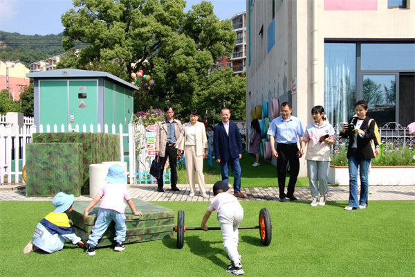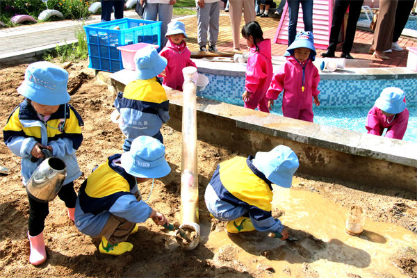 活动中,大家饶有兴致地参观了梦苑幼儿园集童话、绿化、美化、教育化于一体的室内外环境,观看了孩子们精彩的户外自主游戏。小朋友或在绿植区利用屋顶收集的雨水浇灌花草,或在操场上搭建“战地车”、“高台跳水”,或从水池里引水入沙池……孩子们自主游戏在各个区域,尽是欢声笑语。期间,教师鼓励幼儿自主选择、探索每种器械的多种玩法,充分发挥了幼儿的想象力,调动了幼儿的主动性、积极性。