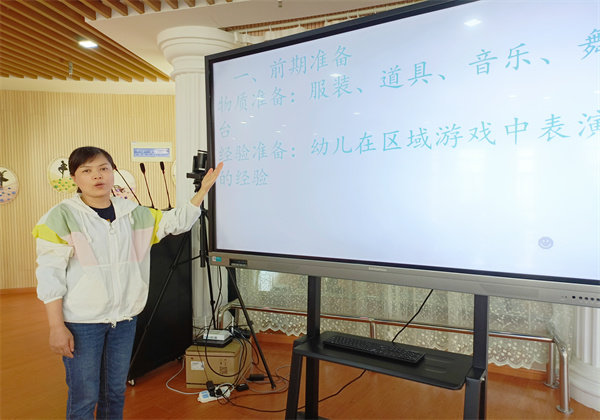 接着由小班到大班的顺序介绍了各年级组的表演游戏演出的总结。各位老师利用PPT的形式,通过前期准备、表演中的发展和改进措施进行展示。其中胡晓峰老师介绍游戏中发现幼儿对表演游戏有着浓厚的兴趣,同时也发现了幼儿对话不流畅、对角色把握不准确等问题,并分享了相应的改进策略。王惊雅老师介绍了表演游戏的前期准备,并分析了在表演游中发现的问题,从教师和幼儿这两个角度来确定改进措施。汪政老师围绕了孩子们在舞台上的表现分享了其中的问题,最后根据发现的问题提出针对性的对策。