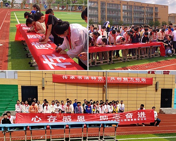 各班同学在横幅上签下了自己的名字。同学们都很激动,有的同学在签名的同时也写下了很多感恩的话语。