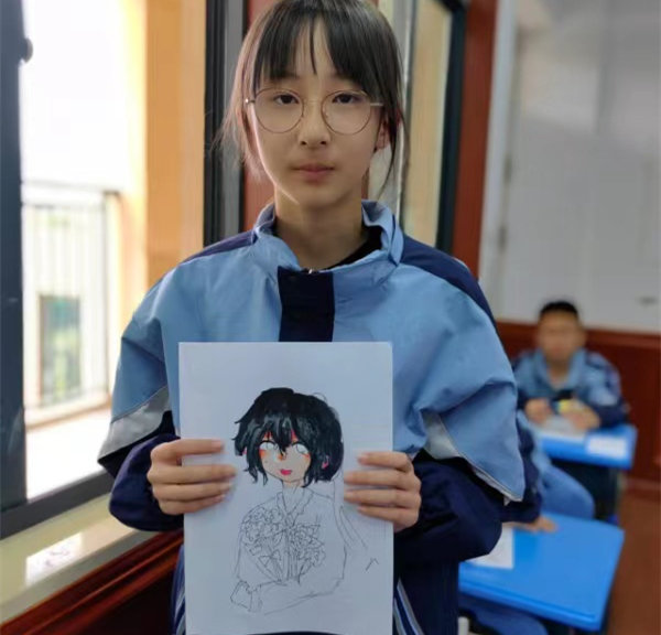 一年前提笔审视当下和未来的郑重和期待再次浮现眼帘,不一样的是,这次多了色彩的忙碌,多了积极的转化,多了对困苦的无畏。小小的黑点无法阻挡一个个学子的踌躇满志。瞧哇,它很快被淹没在金灿灿明晃晃的人生多彩风景中;小小的黑点无法阻拦一个个学子的洪荒之力,看那,它是助你登上光辉人生高峰的垫脚石。随后,同学们对画作进行描述,一个个坚韧有力的文字似乎变幻成一道道金光,光芒四射,冲出教室,冲出校园,冲出更远方……