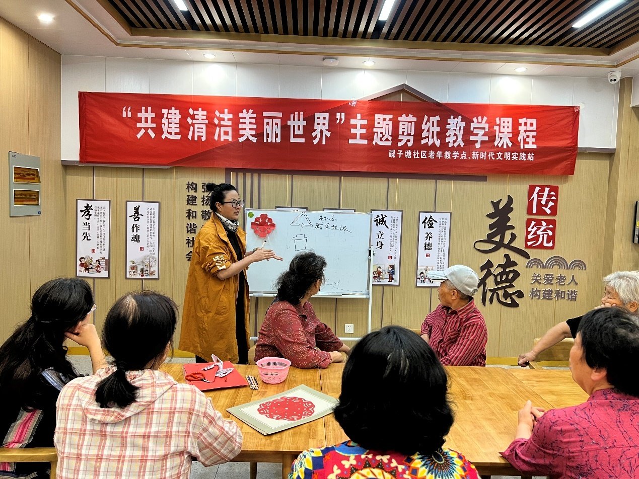 为弘扬中华民族传统文化,进一步牢固树立尊重自然、顺应自然、保护自然的理念,6月5上午,安庆大观区碟子塘社区老年教学点开展“共建清洁美丽世界”主题剪纸教学课程。