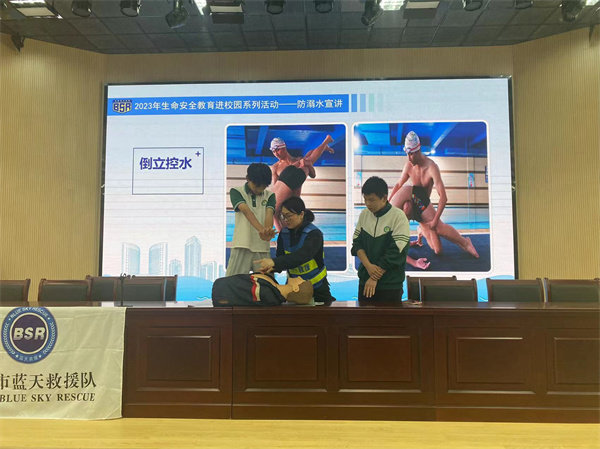 合肥蓝天救援队的宣讲员林俊炜,首先通过一段防溺水的幽默视频,来激发全体学生听讲座的兴趣。在同学们此起彼伏的笑声中,宣讲员说溺水是青少年意外事故的“头号杀手”,溺水身亡的最短时间只有2-4分钟,合肥蓝天救援队参与救援的400多例溺水事故中,只有一例中的溺水人员被救活。这触目惊心的数字,让在座的学生深深意识到预防溺水的重要性。接着,宣讲员介绍了预防溺水与溺水救援。预防溺水首先要远离危险水域,比如水库、水坑、河流、溪边、城市内涝、游泳池等都是危险水域。宣讲员还就游泳注意事项,同伴落水不要错误营救,同伴落水如何正确施救,不慎落水如何自救等方面进行了详细的讲解。他们通过专业的知识让学生们明白怎样有效预防溺水。