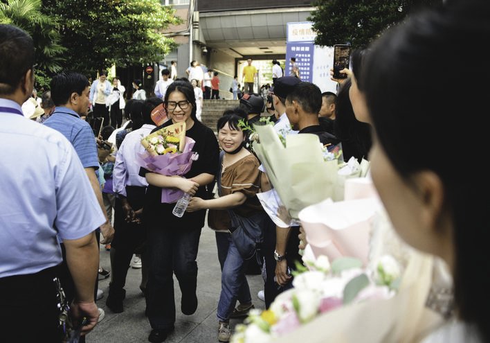 6月8日下午5时10分左右,2023年高考最后一门考试结束。市十中考点外,家长手捧鲜花迎接孩子。