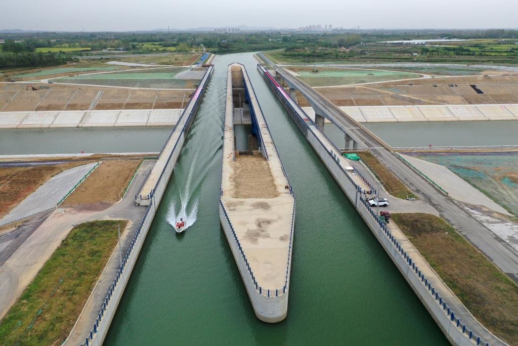 ↑↓2022年12月30日,中铁四局参建的引江济淮淠河总干渠渡槽通航(无人机照片)。