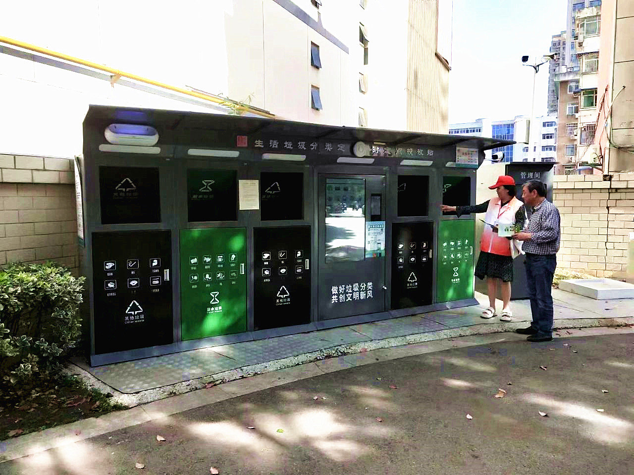 “垃圾分类离不开大家的共同支持与努力,要有从我做起的理念,从现在做起观念。目前垃圾分类投放点共设置四种垃圾桶,请居民朋友们投放时注意:绿色为厨余垃圾......”在金域蓝湾小区内,小广播不时地响起垃圾分类宣传的声音。