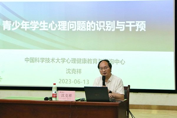 为进一步推进学校心理健康教育与心理危机干预工作,有效提升心理干作能力,守护学生心理健康,6月13日下午,庐阳区校外未成年人心理健康辅导中心联合合肥市育新小学,邀请中国科学技术大学心理健康教育中心主任沈克祥,开展了“青少年学生心理问题的识别与干预”的主题培训。全区各小学专兼职心理健康教师及班主任代表参加培训,育新小学校长姚庆、副校长邓翠银、何晓东及育新小学全体班主任老师共同参会。培训由辅导中心专职心理教师娄乐主持。