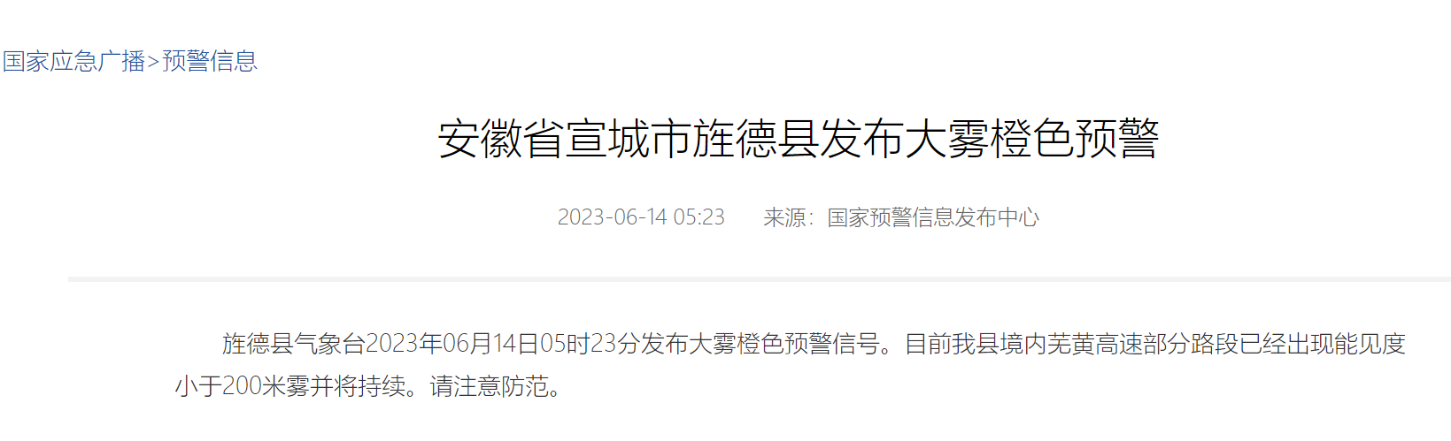宣城市旌德县6月14日、15日连续两天发布大雾橙色预警信号,该县区域已经或将出现能见度小于200米雾并将持续,提醒人们注意防范。