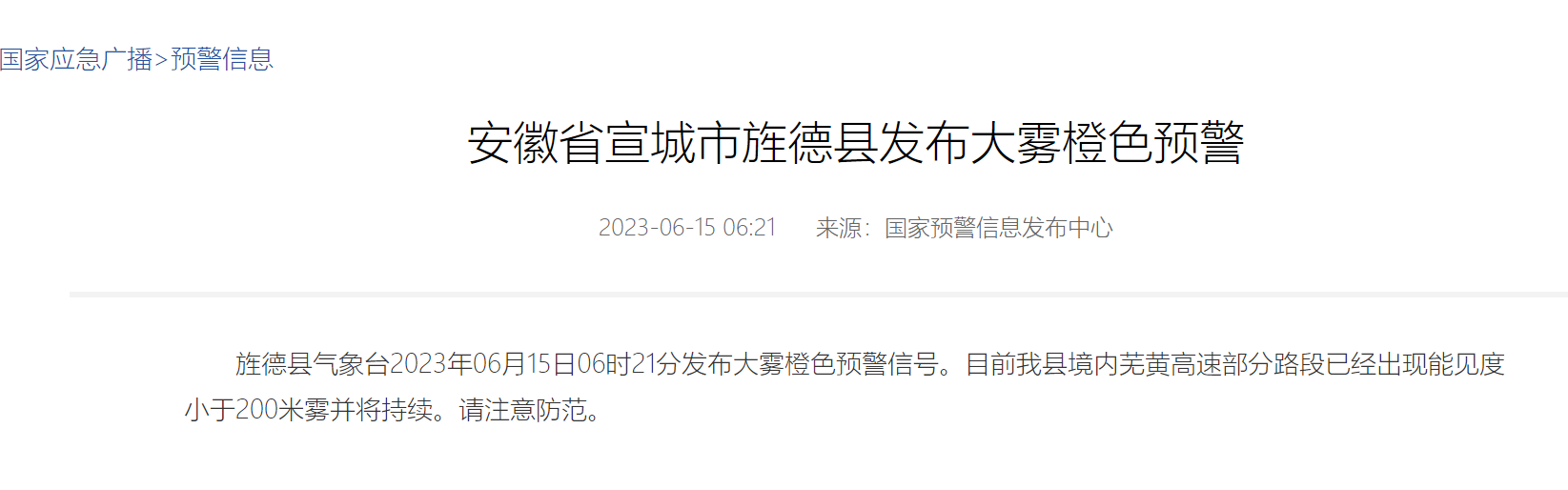 15日06时21分,旌德县气象台继续发布大雾橙色预警,大雾天气易发地仍是县内的芜黄高速部分路段。