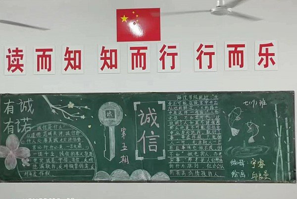 其次,在政教处组织下开展了一系列形式多样、生动活泼、寓教于乐的主题活动。七至九年级各班以“诚信伴我行”“诚信在我心中”等为主题召开了班队会,通过讲历史故事、知识竞赛、警示教育讲座等多种多样的形式,引导学生认识什么是个人信用体系、失信的后果等;七年级组织全体学生开展以“诚信”为主题黑板报和手抄报评选;