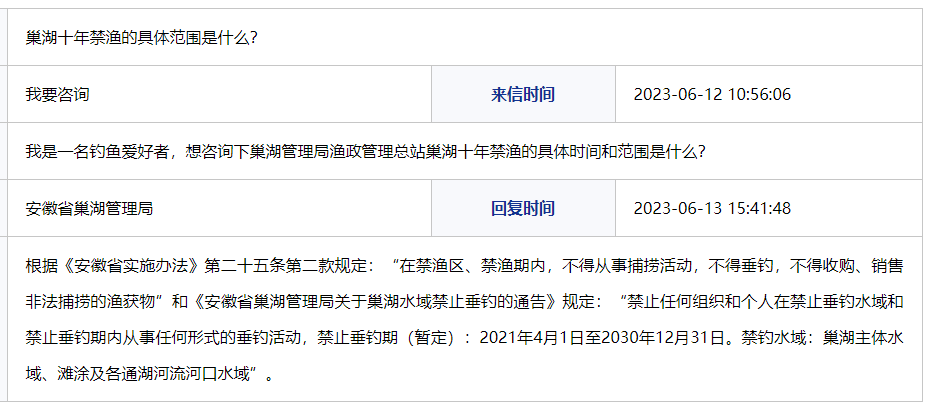 近日,有网友在合肥12345热线留言,咨询巢湖十年禁渔的具体时间和范围是什么?