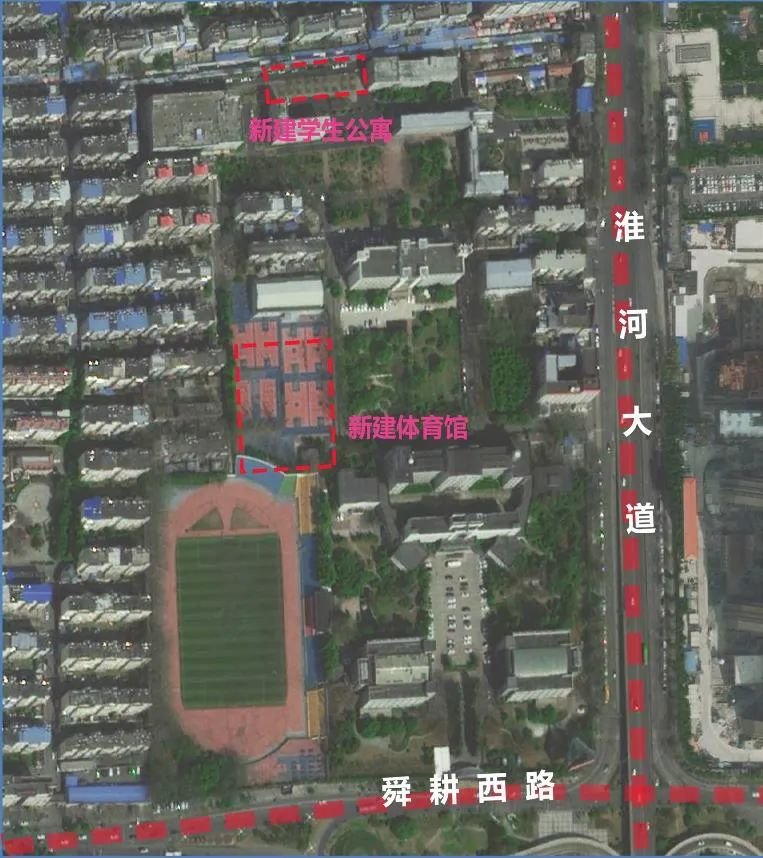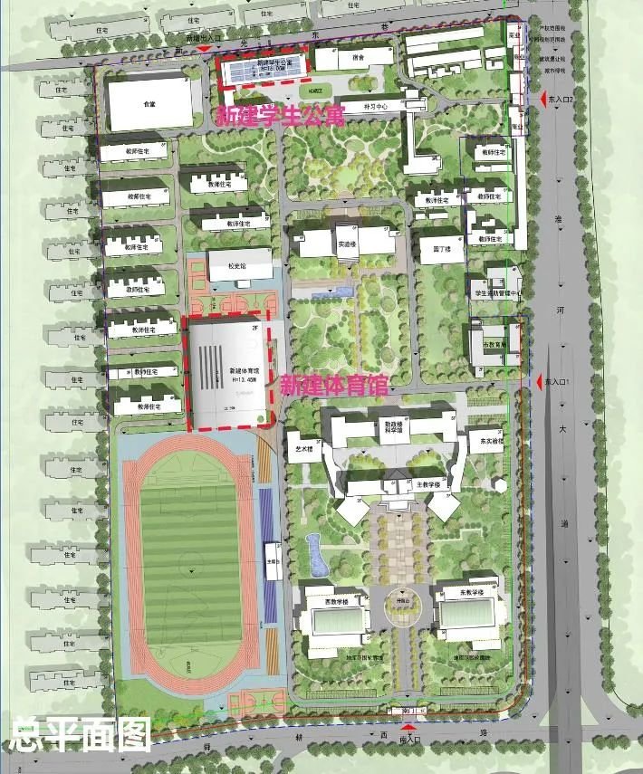 新建体育馆地块位于校园现状田径场北侧;新建学生公寓地块位于校园北部生活区。