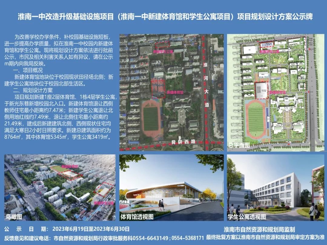为改善学校办学条件,补校园基础设施短板,进一步提高办学质量,拟在淮南一中校园内新建体育馆和学生公寓。现将规划设计方案依法进行批前公示,市民及相关利害关系人如有异议,请在公示期内向我局反映。