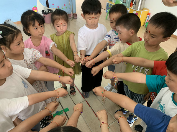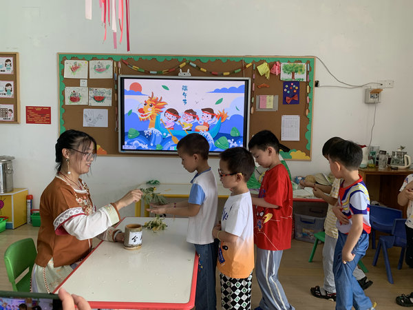 为了让孩子们亲身体验传统节日的风俗习惯及文化,幼儿园以年级组为单位开展了各种庆端午活动,如大班组开展了端午节知识小问答、包粽子、品粽子等活动,中班组组织孩子们挂艾草、踩艾草、沐兰汤、点朱砂、系彩绳等,在参与活动的过程中孩子们知道了原来端午节有这么多好玩的事情,而且都有着祈福纳吉的美好寓意。