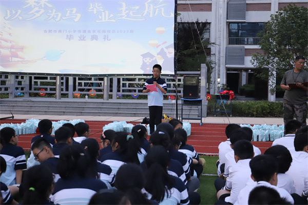 吃过晚餐后,孩子们齐聚在南小恒盛的操场,南小恒盛校区“以梦为马,毕业起航”毕业典礼正式拉开序幕。南小恒盛校区校长童乃梅,副校长马璇、陈祥龙,大队辅导员焦咏梅及六年级毕业班全体师生参加了典礼。