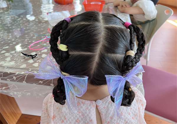 活动开始,保健老师李蓉淼向大家介绍了扎辫子的要求和细则,使用6根皮筋、4个发夹,现场为一名孩子花式梳辫子,看!保育老师们巧手编发,花样百“辫”,她们除了是生活小能手,精巧细致的编发也不在话下哦!