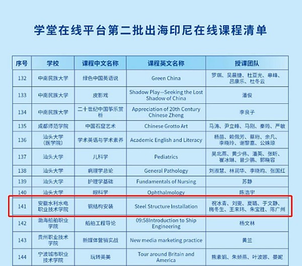 在国家大力发展职业教育数字化资源的背景下,安徽水利水电职业技术学院按照“中国特色,世界水平”的国际慕课建设目标不断推进课程建设国际化,积极推动优质课程走向海外。本次《钢结构安装》课程通过学堂在线国际版成功“出海”印尼,将进一步促进学院课程资源建设、深化教育教学改革,提升学院的国际化办学水平。(文图/于文静)