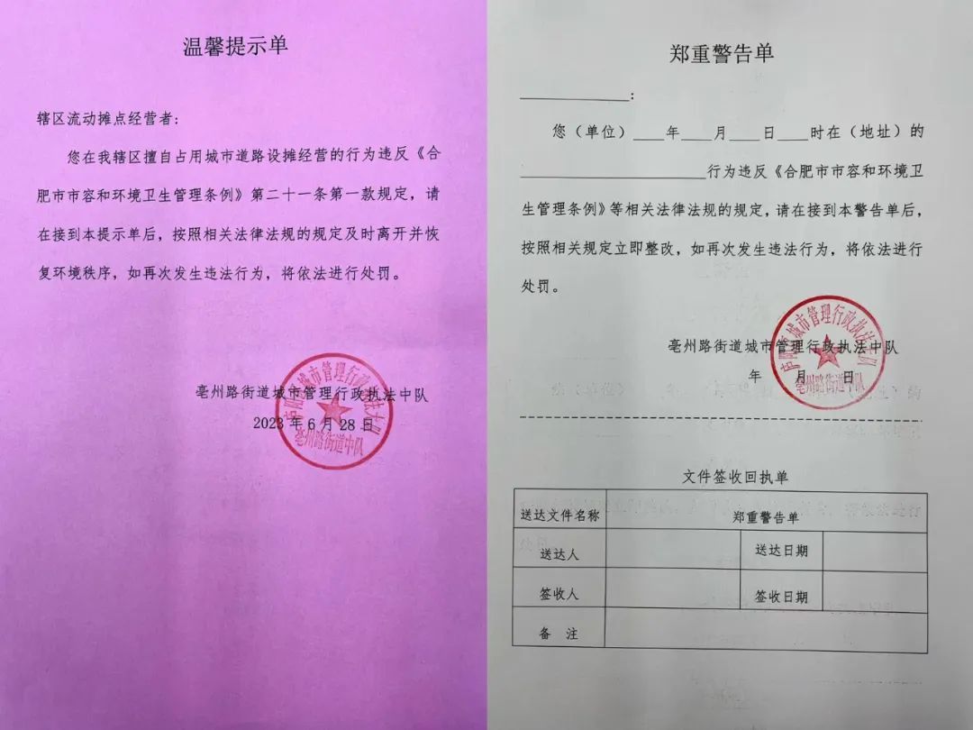 近日,合肥市庐阳区亳州路街道城市管理部积极推行有“温度”的城市管理模式。在日常巡查中,城管执法人员坚持“首违不罚”的原则,对违反城市管理相关规定的行为,根据不同情况向当事人下达“温馨提示单”及“郑重警告单”,告知商户们在经营过程中自觉履行“门前三包”责任,维护辖区的市容环境秩序。