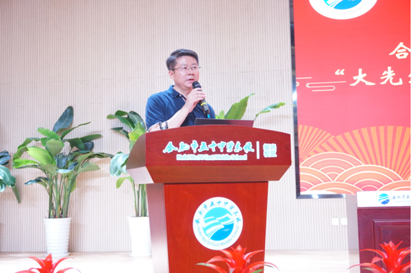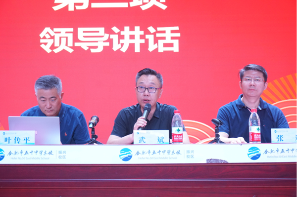 蜀山区教育体育局党委委员、副局长、合肥市五十中学东校教育集团党委书记、校长张斌致辞。他在致词中说,人生路上能遇到好老师是最大的幸福。五十中学东校作为五十中的发源地,教育界的常青树,是因为东校一直重视师资队伍的建设,培养了许许多多为学、为事、为人的“大先生”。这些“大先生”是五十中不断开枝散叶的中坚力量。支持东校持续发展的动力就是教师队伍的建设,教师终身学习、终身发展是东校持续发展的源头活水。今天教师成长中心的成立,就是想为东校老师的发展提供一个平台,接下来将会有一揽子的培训项目。张斌对东校未来的发展正在谋划,充满憧憬。