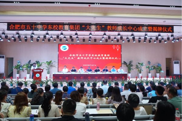 风吹七月荷香远,蝉鸣绿阴柳丝长。7月2日上午,合肥市五十中学东校教育集团校本培训在振兴校区举行。培训之前,举行了合肥市五十中学东校教育集团“大先生”教师成长中心成立暨揭牌仪式。合肥市教育科学研究院院长叶传平,合肥市教育局教师事务发展中心副主任张少华,蜀山区教育体育局党委书记、局长武斌,蜀山区教育体育局机关党支部副书记王保胜等领导出席了揭牌仪式。
