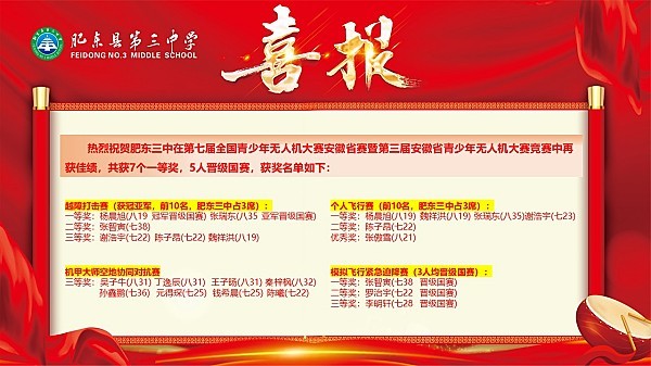 6月30日至7月2日,全国青少年无人机大赛暨安徽省第三届青少年无人机大赛在合肥一中举行,肥东三中代表队共获得7个一等奖,5人晋级国赛。