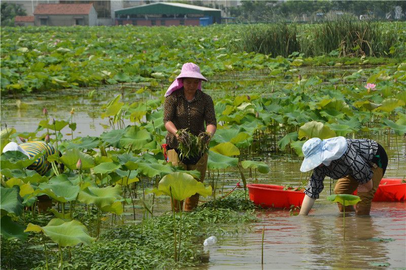 近日,村民在利辛县阚疃镇代圩新村400亩荷塘内进行清理杂草等农事劳作。该村村民抢抓农时,加强荷田管理,促进增收增效,呈现一派繁忙景象。
