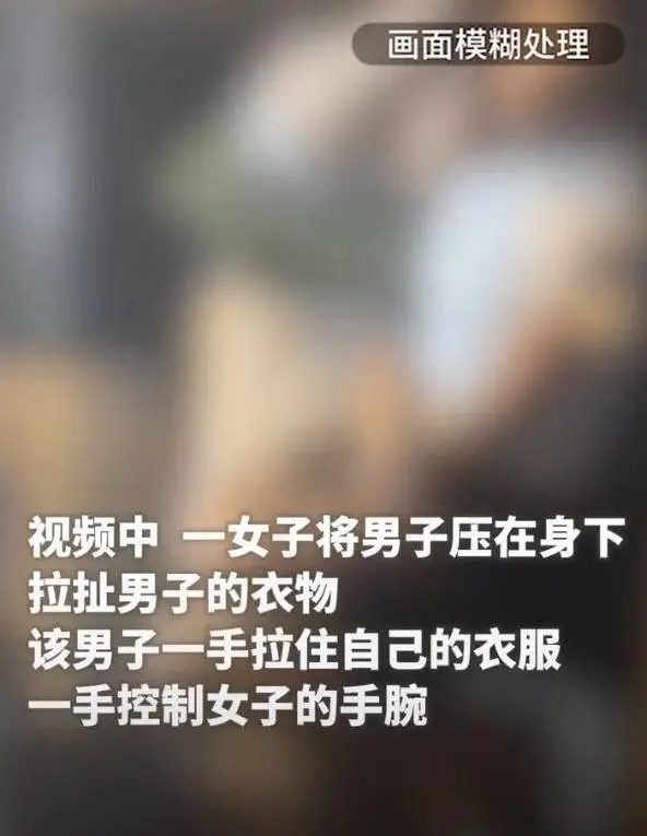 视频内容显示,一女子将一男子压在身下,拉扯男子的衣物。男子则是一手拉住自己的衣服,另一只手控制女子的手腕。